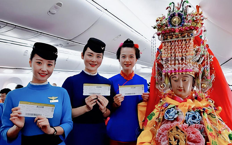 2017年起,妈祖开始了一场场令人瞩目的“跨国巡安”。妈祖“拿着”虚拟身份证,搭乘飞机、邮轮、动车,把平安吉祥送到马来西亚、新加坡、菲律宾、泰国等国家。所到之处,万人空巷,掀起“妈祖热”。
