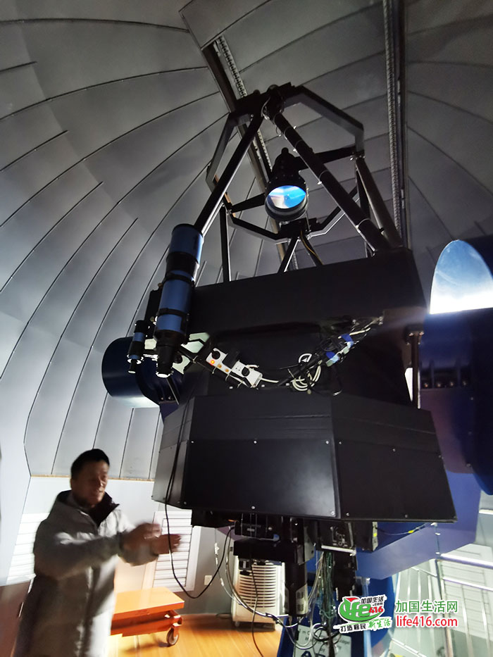这是安装在天文台内的口径60厘米直径反射式天文望远镜,并配有太阳色球望远镜、天文科普教学仪器、中小型便携式望远镜等设备。