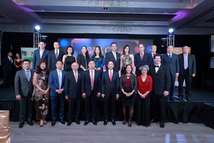 嘉宾们在CPAC慈善晚宴上合影,前排左起:加拿大中国专业人士协会(CPAC)理事周津宇、CPAC前任会长、现任理事杨静、CPAC基金会荣誉顾问郭剑民(David Kuo)、省议员白必勤(Aris Babikian)、中华人民共和国驻多伦多总领馆代总领事庄耀东、CPAC会长肖楚强(Eric Xiao)、国会议员叶嘉丽(Jean Yip)、省议员韦邱佩芳(Daisy Wai)、主题赞助商代表TD Insurance Meloche Monnex副总裁Max Stiles。后排左起:CPAC执行总监时安迪、CPAC理事宇鹭、徐明蓉、CPAC基金会理事、2019年度慈善晚宴联合主席Lai-King Hum、CPAC副会长、2019年度慈善晚宴联合主席王辰、CPAC常务副会长、财务长王体、CPAC理事宋培思、CPAC基金会理事张怡专、CPAC理事赵慧泉、沈浩、于首三。