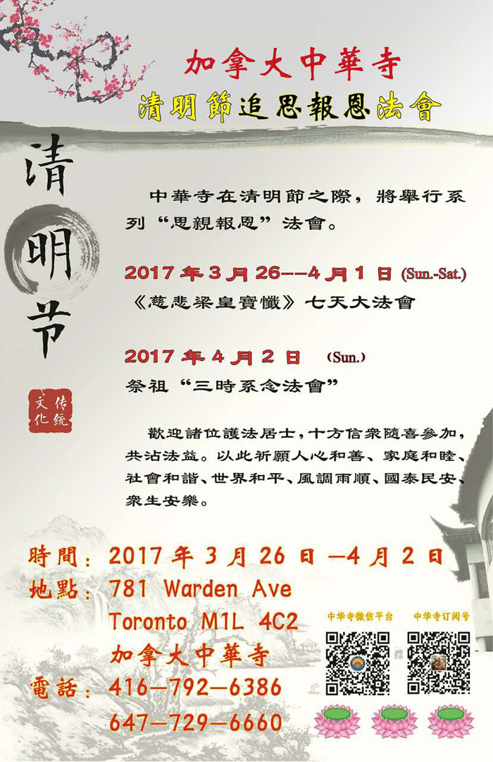 “清明时节雨纷纷,路上行人欲断魂。”在清明节即将到来之际,加拿大中华寺将于2017年3月26日至4月2日期间分别举行《慈悲梁皇宝忏》七天大法会和祭祖“三时系念法会”,欢迎诸位护法居士、十方信众随喜参加,共沾法益。