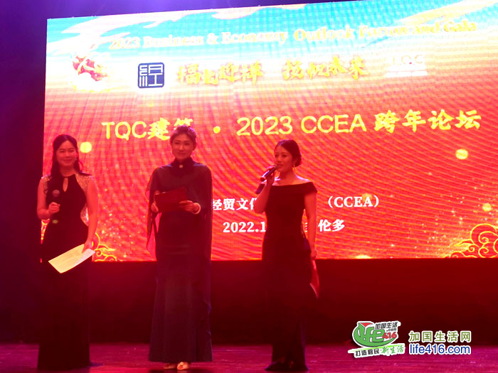 晚上的 TQC• 建筑 CCEA 2023 “福兔迎祥 扬帆未来” 跨年论坛的晚宴由加中经贸文化交流协会副会长韩笑博士、王慧和王晓蓉教授联合主持。