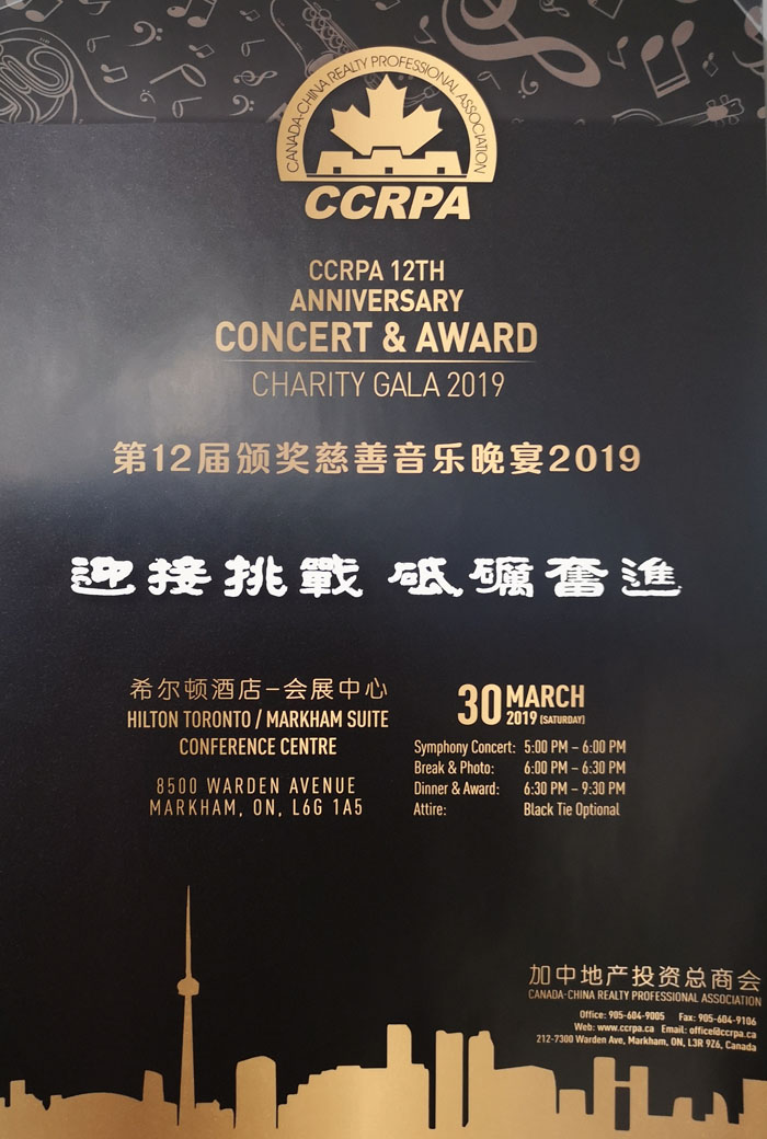 【加国生活网】加中地产投资总商会(CCRPA)于2019年3月7日举行新闻发布会,宣布将于3月30日在多伦多/万锦Hilton 希尔顿酒店举行一年一度的新春GALA暨顶尖经纪及地产院士颁奖慈善音乐晚宴。今年的晚宴不仅有政要祝贺、表彰嘉奖、更有慈善捐助以及加拿大皇家音乐学院RCM的交响乐团专场音乐会表演。来自大多伦多及加国政界、地产界、金融界、社区等近千人将出席这次盛典。