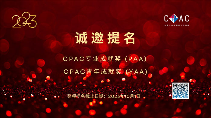 【加国生活网】加拿大中国专业人士协会(CPAC)自即日起接受2023年度彰显移民贡献的CPAC专业成就奖与CPAC青年成就奖提名,诚邀各界人士积极参与。提名的截止日期均为2023年10月1日。奖项将于12月3日在CPAC年度慈善晚宴上颁发。