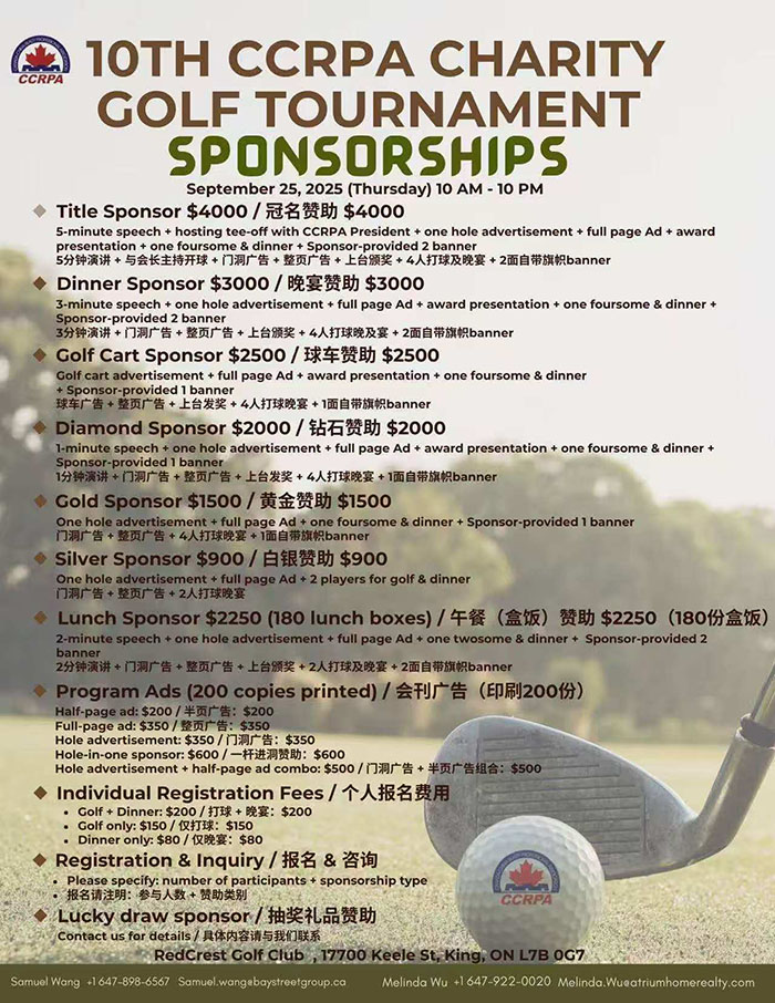 加中地产投资总商会(CCRPA)诚挚邀请地产及相关行业精英们积极参与、赞助并支持本次慈善高尔夫盛会,共同携手奉献爱心,为行业及同仁鼓舞士气,推动地产行业发展!
