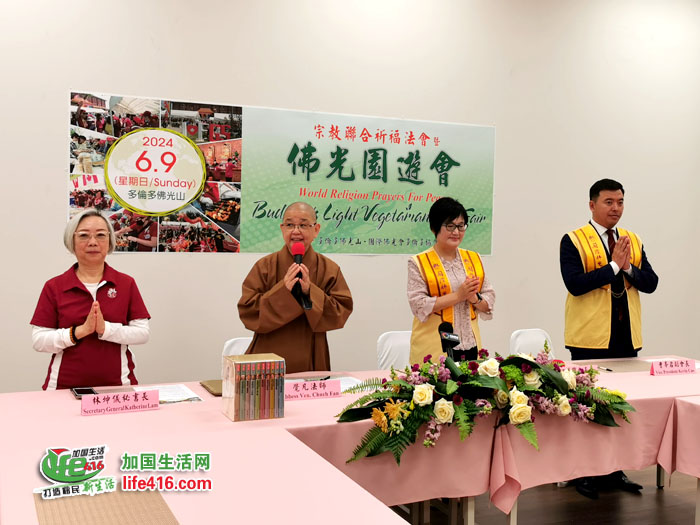 多伦多佛光山和国际佛光会多伦多协会于2024年5月21日举行新闻发布会宣布“2024宗教联合祈福法会暨佛光园游会”将于6月9日举行,“2024宗教联合祈福法会暨佛光园游会”记者会,多伦多佛光山住持觉凡法师、国际佛光会多伦多协会会长何美宝(),副会长曹峰岩(右一)、秘书长林坤仪共同主持。