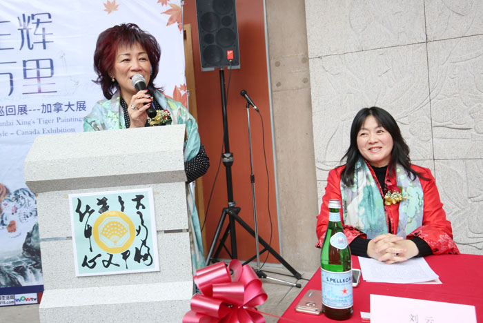 “虎代表着力量、勇气、吉祥。其实我家里也有一只‘虎’。我的丈夫就是属虎的,”多伦多市议员封赖桂霞Cynthia Lai说,“巧合的是,这次画展举办地在我的选区——世嘉堡北区里,所以我代表多伦多市长庄德利John Tory、代表选区热烈欢迎中国著名画家邢春来先生的到来,并预祝画展圆满成功!”