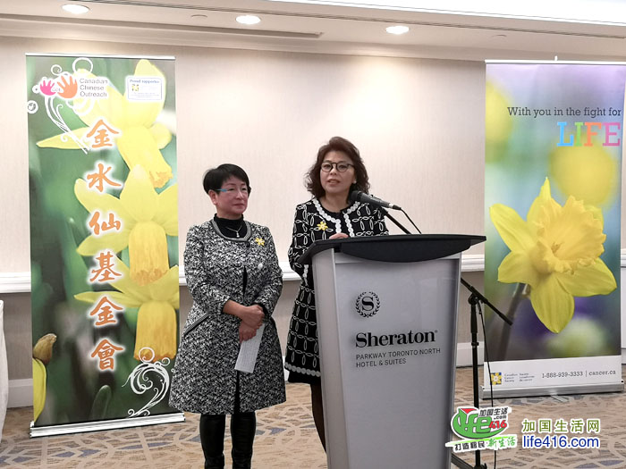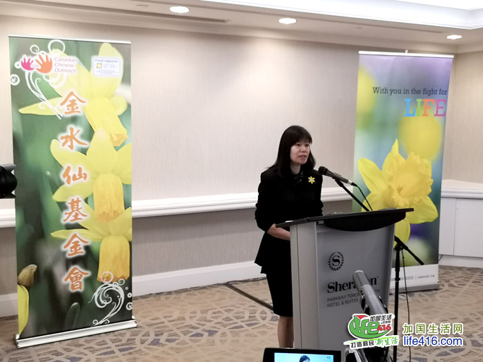 加拿大防癌协会慈善筹募总监 Nancy Yarmel 祝贺金水仙基金会再次成功举办这晚宴,并表示癌症治疗方面取得骄人成绩,经由多方有效率地全面推行各项目进展计划, 有赖通过持续的善长捐款, 才有可能实现各项计划。