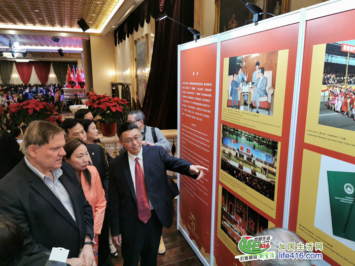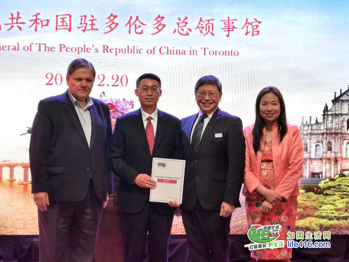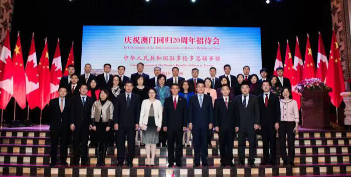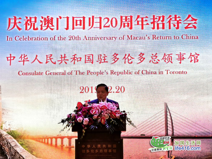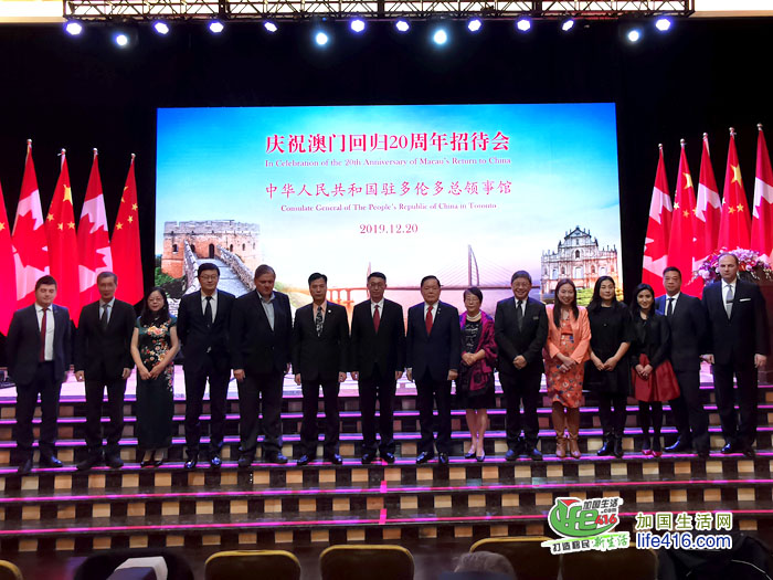 【加国生活网】中国驻多伦多总领事韩涛于2019年12月20日举行招待会,庆祝澳门回归祖国20周年。加拿大联邦参议员胡子修、多伦多市市议员詹嘉礼(Jim Karygiannis)、万锦市市议员杨绮清、列治文山市市议员陈志辉,前联邦众议员谭耕、前安大略省国际贸易厅厅长陈国治等加三级政府代表,塞尔维亚、孟加拉国驻多伦多总领事等驻多领团代表,香港驻多伦多经济贸易办事处处长巫菀菁,多伦多澳门会会长袁小虹,领区华侨华人、中资机构、留学生代表及当地各界人士400余人出席。