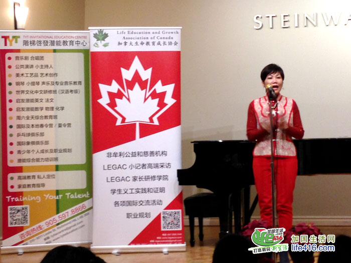 加拿大生命教育成长协会会长、LEGAC国际艺术文化交流中心主席、全球杰出华人艺术家协会加拿大分会理事、全球杰出少年演奏家选拔赛执行总监Tina Tao向各界来宾介绍音乐节及相关协会未来的发展目标。她提倡:教育是要带领每个家庭成员融入到实践和社会公益发展当中来,要让每个学生知道个人价值和社会价值的对接点,要在实践和社会发展中发现自己的亮点和光芒,建立自己的人生规划和目标。