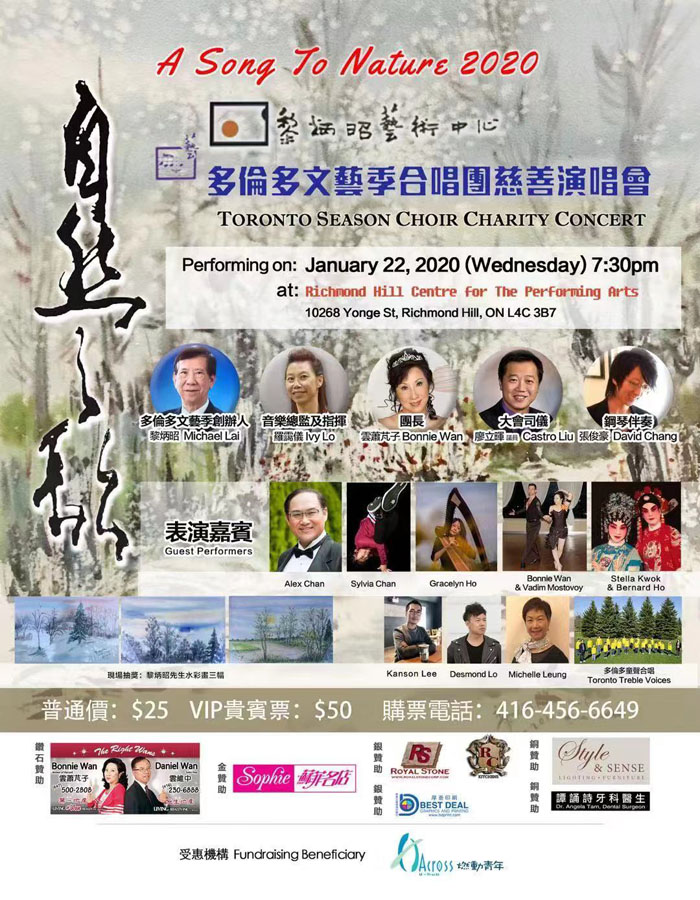 黎炳昭艺术中心于2020年1月7日举行新闻发布会,宣布为庆祝多伦多文艺季合唱团成立二十周年,特举办"自然之歌2020"慈善演唱会为燃动青年筹款。