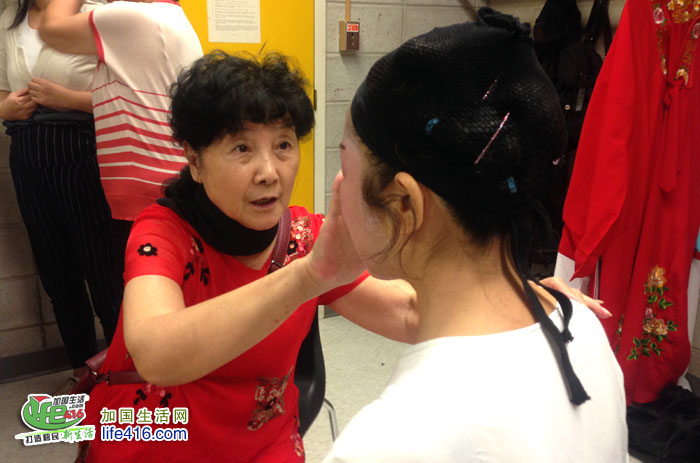 袁小云老师在后台亲自示范多伦多越剧团团员们如何化妆