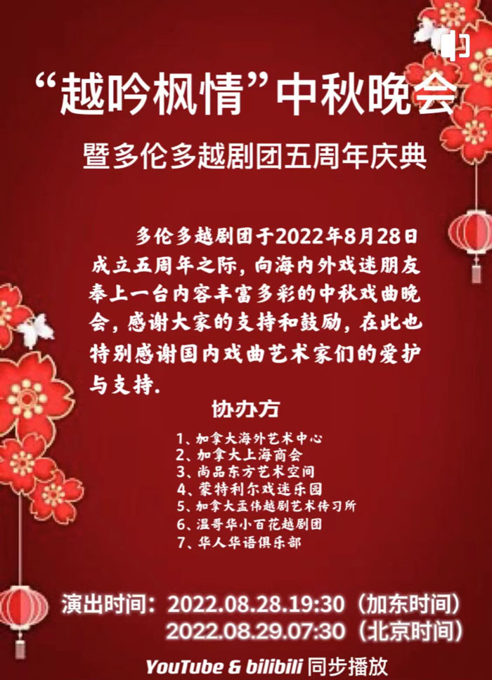 【加国生活网】喜欢越剧的朋友们快快看过来,“越吟枫情”中秋晚会暨多伦多越剧团五周年庆典将于加东时间2022年8月28日星期日7:30pm(北京时间8月29日7:30am)在Youtube和Bilibili同步播出,有多位戏曲名家助阵,欢迎大家捧场。