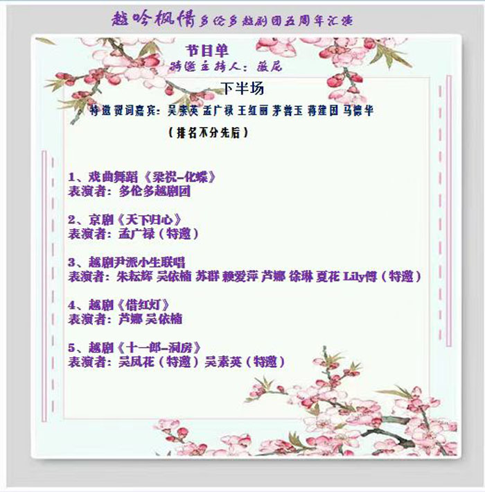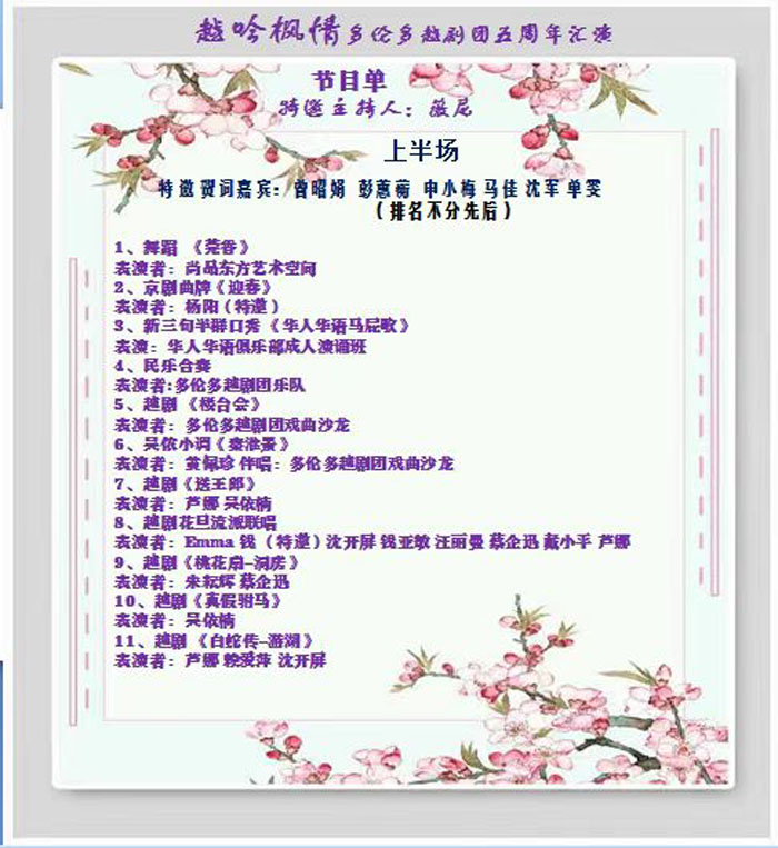 多伦多越剧团感谢此次五周年演出的协办方加拿大海外艺术中心、加拿大上海商会、尚品东方艺术空间、蒙特利尔戏迷乐园、加拿大孟伟越剧艺术传习所、温哥华小百花越剧团、华人华语俱乐部的大力支持,也特别感谢国内外戏曲艺术家们的爱护与支持。