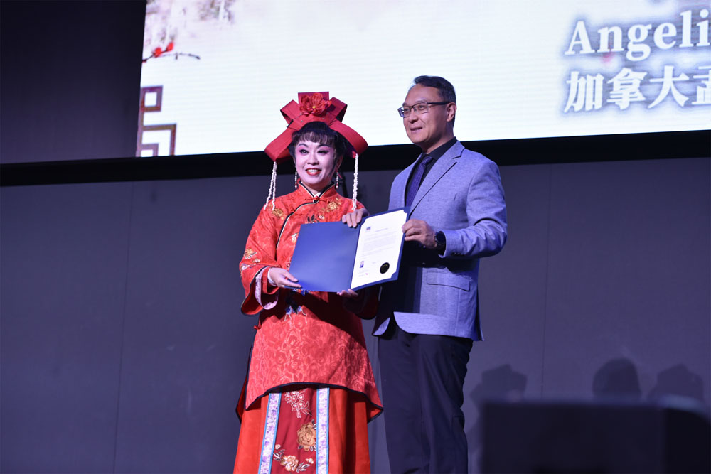 柯文彬议员助理Tina Zhang 向多伦多越剧团团长芦娜颁发贺信