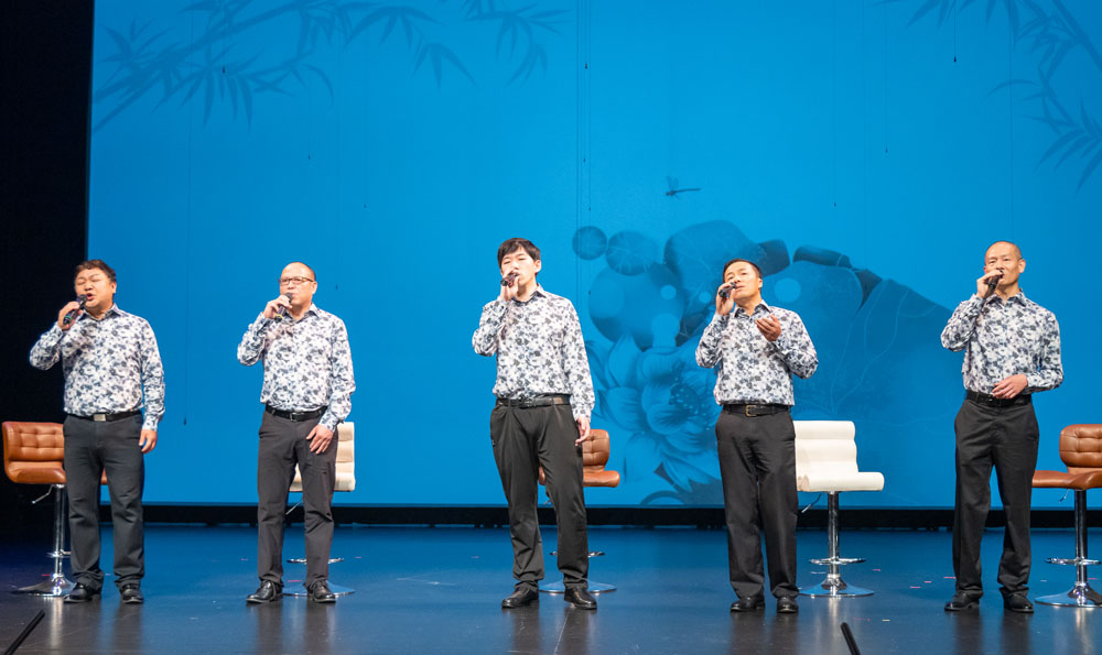来自四川大学加拿大校友会的五位男生,为晚会献歌五重唱《传奇》,行云流水一般的空灵清雅的和声,真的好像把观众带到了天边。