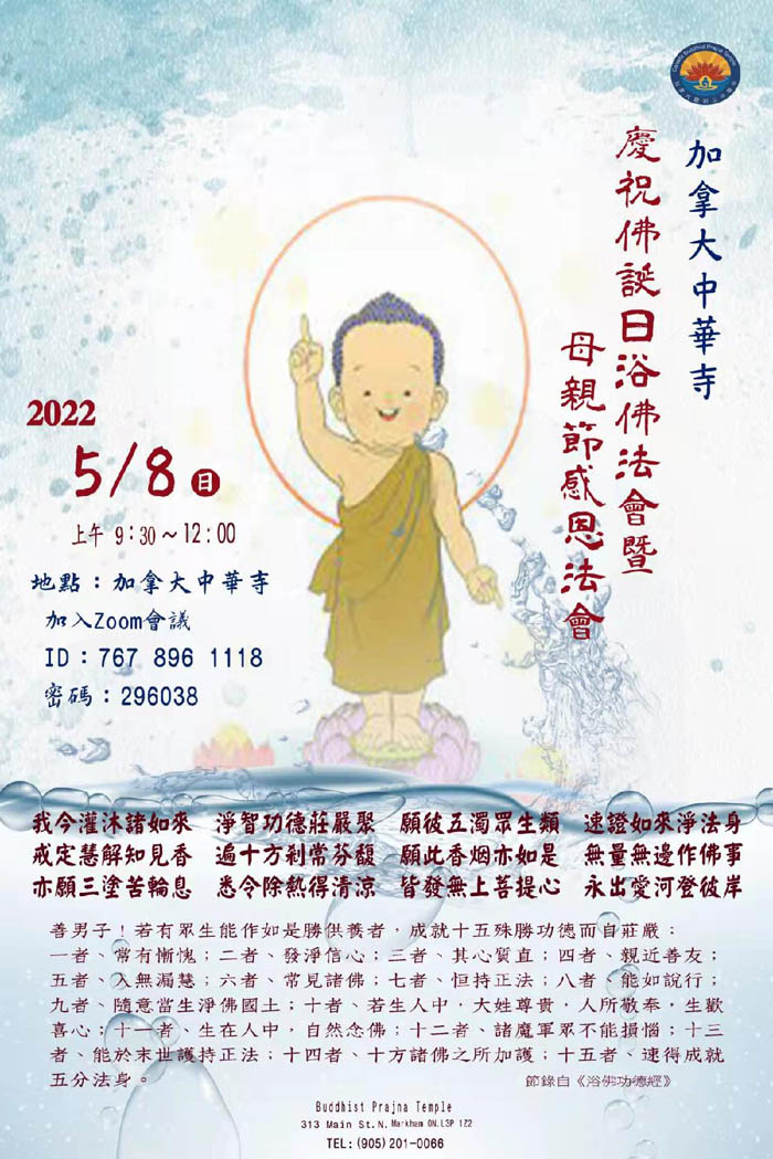 【加国生活网】 五月是充满感恩的月份,是佛历2566年感念本师释迦佛尼佛为了一切有情而诞生于娑婆世界的恩德,降生示现于人间的日子,亦是正值母亲节,是报父母恩的好时机,表达对母亲生养我们由衷的感谢。加拿大中华寺在此殊胜之日以供灯为三宝长久住世之祈请,亦为母亲们免费供灯以智慧光明能除一切苦难得以究竟解脱。谨订于五月八日上午九点三十分开始,于中华寺大雄宝殿举行一年一度的浴佛法会,在浴佛偈中“我今灌沐诸如来”表示不只灌沐一尊佛,而是十方三世一切佛。欢迎十方善信法友一同回寺参与法会浴佛,得大善根获大善果。以此功德回向三宝慈光加被,以此法会共修功德,上报四恩,下济三有;并回向祈愿世界和平,国泰民安,疫情消除,社会和谐,世界和平法界有情,同沾法益,共证菩提。