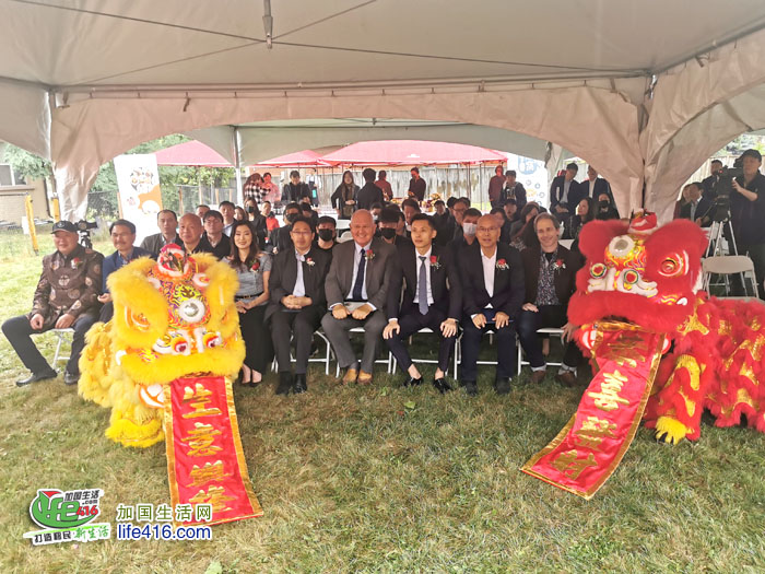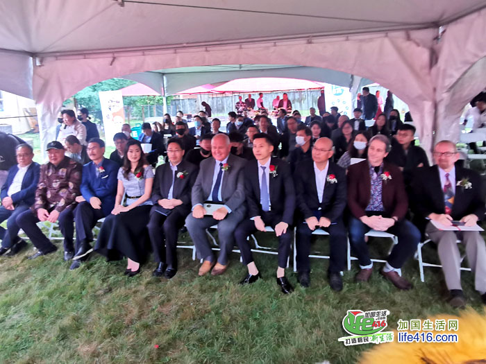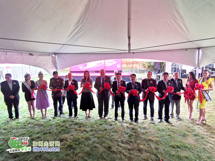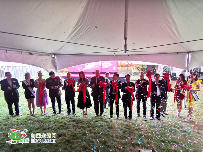 在主持人“三、二、一,揭牌!”的倒数声中,CEO Rex Lin, CFO Michelle Wang、万锦市长薛家平、联邦议员蒋振宇、安省议员柯文斌、万锦市议员何胡景、万锦市经济商业发展委员会总裁 Mr. Chris Collicci多族裔媒体协会秘书长Byron Calvo、丰泰集团总裁魏成义以及新动力传媒荣誉主席Mel Cohen携手,为中凯金融开业剪彩。