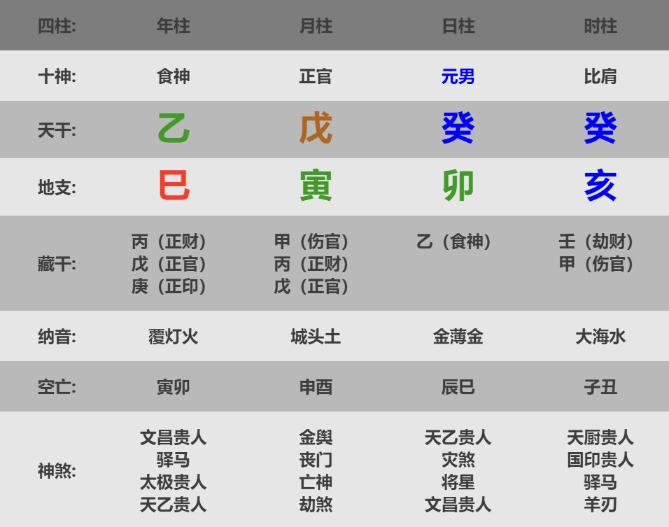 在整个八字盘中,表面上看,绿色属木的能量有3个(天干乙、地支寅和卯),蓝色属水的能量有3个(天干癸和癸、地支亥)、红色属火的能量有1个(地支巳),褐色属土的能量有1个(天干戊)。
