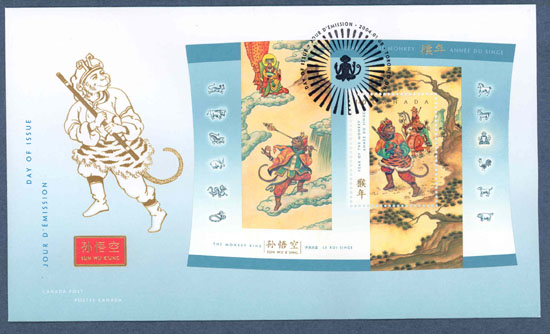 加拿大发行的生肖邮票真的是年年有新意,年年有提高,印刷也特别讲究。象第一轮生肖邮票中的猴票(2004年),就是以西游记中的孙悟空为原形设计的,印刷中还带有凸凹金线,相当花成本的。