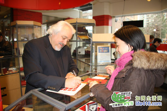 2012年1月10日当天,加国生活网小编专门去多伦多市中心的Toronto Atrium on the Bay Post Office 采访龙年邮票的首发仪式。现场可热闹了,好多华人在买龙年生肖邮票。该邮票的设计师Louis Fishauf 也在现场,大家买了后还可以签名,邮品就更有纪念意义了。