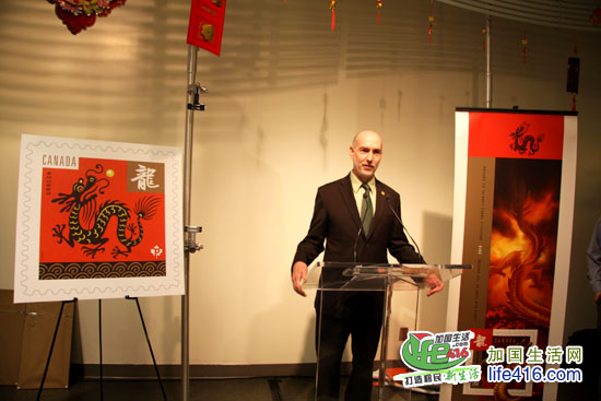 加拿大邮局的Director - Jim Phillips 现场致欢迎辞,并介绍2012龙年邮票的详情。