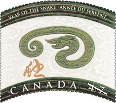 加拿大曾于2001年发行过一套蛇年生肖邮票。2013年发行的蛇年邮票,是加拿大邮政局设计并发行的第二轮12生肖邮票中的第5套生肖邮票。加拿大邮政局于1997年首次发行农历新年生肖邮票系列(Lunar Year),系列之首是1997年的牛年邮票,系列之末2008年的鼠年邮票。