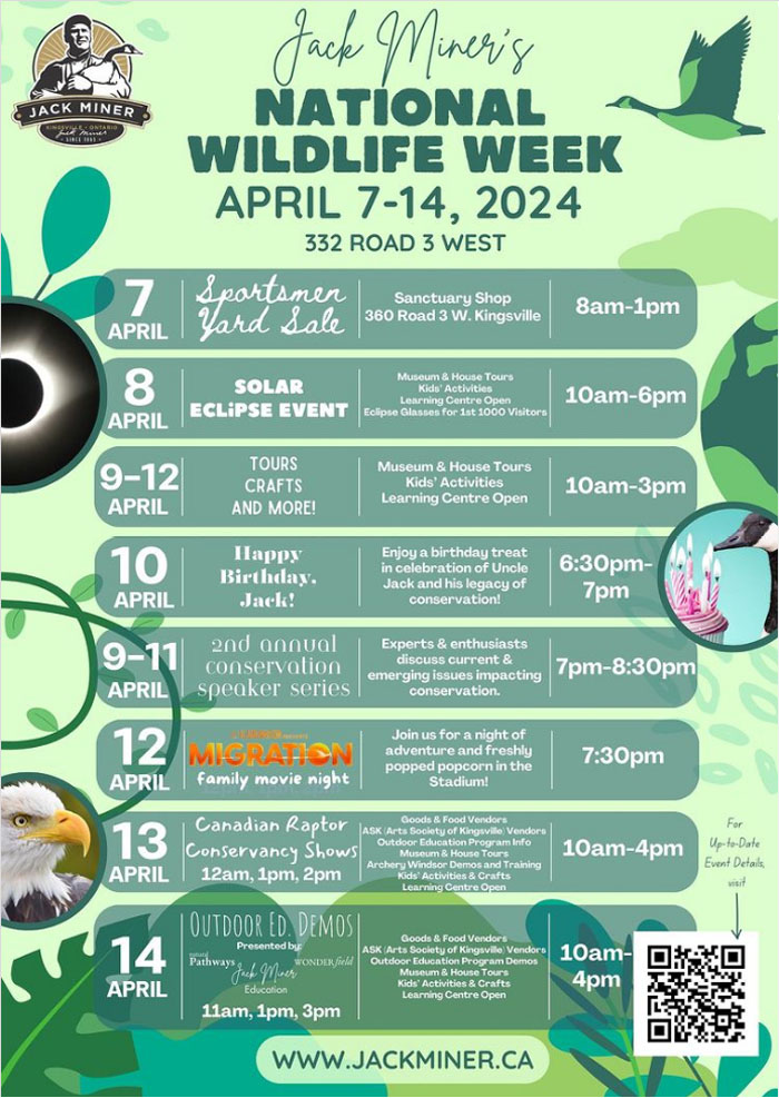 安省Kingsville的候鸟保护区(The Jack Miner Migratory Bird Sanctuary)将在4月8日举办日食观赏派对,拉开国家野生动物周(National Wildlife Week)的序幕,前 100 名参加者将获得日食眼镜。现场有儿童活动和手工艺品摊位,所有建筑均开放供参观。
