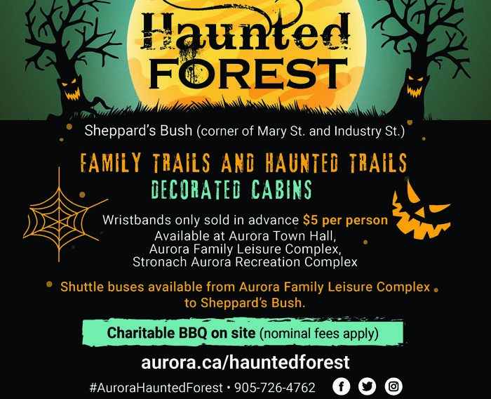 【加国生活网】这个周末,多伦多北部小镇Aurora 将举办一个别开生面的万圣节活动——A Haunted Forest,即位于Aurora 的Sheppard's Bush Conservation Area 将会变成一个“鬼怪森林”,里面充满了吓人的Trail、鬼怪城堡、骨头、女巫和许多吓人的场景哟,有胆你就去看看。你知道吗,这个活动迄今为止已经举办了20届了。为了方便大家参加这个活动,小镇提供从the Aurora Family Leisure Complex 到 Sheppard's Bush的Shuttle Bus 接送服务。该活动需要门票,门票分两种:$5 (黄色腕带)— 可进入家庭步道、家庭小屋和鬼故事;$6 (霓虹红腕带)— 可进入所有步道,包括家庭步道、恐怖步道、小屋和鬼故事。请提前到小镇以下地址购买门票: