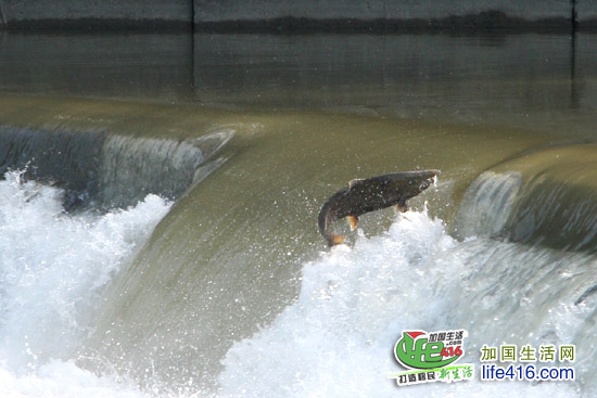 第二年小编再接再励,终于看到了鱼儿踏浪而舞的瞬间,刹那间,已经分不清是鱼儿自己跳的,还是浪花把它托起来的……详情请点击《到Humber River 看三文鱼回游》