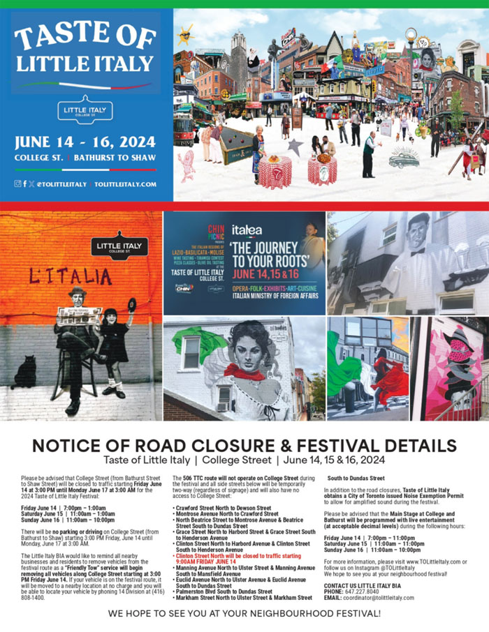 【加国生活网专稿】小编最新爆料:Taste of Little Italy 2024 小意大利美食节将于本周末(2024年6月14日至16日)在多伦多“小意大利”举行。每年的六月,在多伦多市中心的 College Street,从Bathurst 至 Shaw 的这片被称为“小意大利”的区域都会举行美食节,届时市民们除了可以吃到正宗的意大利Piazza,还可以吃到许多带有意大利特色的美食,比如意大利卷饼、意大利特色冰淇淋等。还有啊,大家在吃的同时,小意大利的街道上有各种音乐艺术家们现场表演,你可以听到意气奋发的男高音《我的太阳》,也可以听到电影《教父》的主题曲《Speak Softly Love》(柔声轻诉)倾诉衷肠……这个周末,每年一度的小意大利美食节,千万不要错过哟,因为不用去意大利,你就能在多伦多本地体会浓浓的意大利风情和美食,岂不快哉!