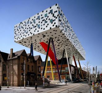 Ontario College of Art & Design - OCAD是加国最大的一所艺术与设计大学,着重创意及革新。OCAD的学生不单向往其独一无二学习环境,当中糅合了实验性的工作室教学方法和人文学科,他们更可享用这幢离路面26米高,仿如空中楼阁的超凡设施。该座名为 Sharp Centre for Design 的独特10层建筑物是由英国前卫建筑师Will Alsop设计,用了许多明亮颜色的支柱,其独特的设计视角将安省美术设计学院变成了一个巨大的、后现代树屋(tree house),简直就是一个律动着生命的精灵,亦让此幢建筑成为多伦多建筑界的著名地标和多伦多著名的旅游景点之一。