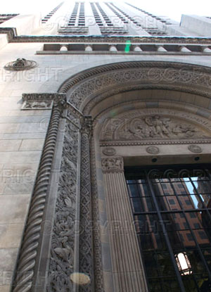 320 Bay St.; Sat & Sun: 10 a.m. to 5 p.m. (F. Hilton Wilkes with Mathers & Haldenby and Sproatt & Rolph, 1928-30) Award-winning restoration of the Art Deco Banking Hall in 2001 (funded by CIBC Mellon). Canadian symbols of wheat sheaves and fleurs-de-lys appear on the Corinthian columns. The grand Romanesque entrance features a coffered vault flanked by fluted pilasters.