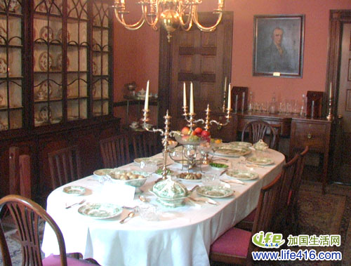 这是Campbell法官大人他家的餐厅。看来人比人得死,看人家200年前就住这种大house,餐厅一点也不比现代的逊色。