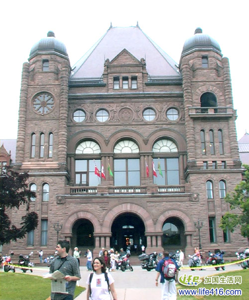 【加国生活网专稿】Ontario Legislative Building 即安省议会大楼是安大略省省政府的办公场所,位于多伦多的Queen's Park。该建筑建于1893年,其中西侧那部分曾毁于大火,现在看到的是重建的,所以较东部那部分现代些。安省议会大楼平日里也对外开放。当议员们在chamber里大声辩论的时候,你还可以坐在那里旁听呢。
