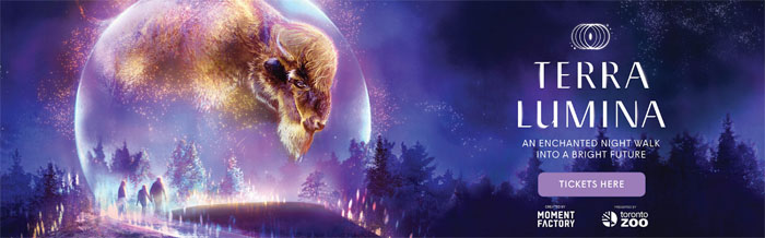 【加国生活网】Terra Lumina 是 Moment Factory 的 Lumina 夜行系列中创造的第十一种独特体验,今年的体验就是在多伦多动物园里。届时当夜幕降临后,参观者将被邀请沿着 1.5 公里的步行路径来回穿梭于未来,享受身临其境的体验。当一个未来大门将参观者带入 2099 年的发光奇迹时,神奇的旅程就开始了,这是一个人类与自然学会和谐相处的时代,这也是一个让自己沉浸在充满活力的灯光、多媒体效果和令人叹为观止的视频和原创配乐的时刻。快去进入那个迷人的世界吧,相信所有人都会流连忘返的。票价:$29.99+HST