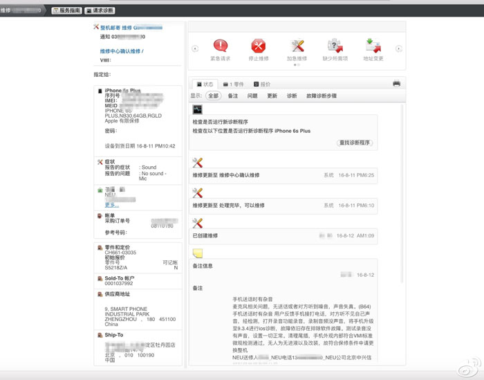 过了几分钟,群内大神刚把维修店地址截图发给我,我的办案民警给我打电话了!他说今天是他年假的最后一天,明天上班,朝阳督查那边把情况都告诉了他,微博上那位应该是真正的警察,不用怀疑,北京警方确实有这样的一股编制。我顿时觉得北京的警察真好啊!赶紧跟他说我查到了手机维修换机的地址,售后维修店在北京牡丹园,他疑惑了下,问我这信息靠谱吗,我说我马上把截图发到您手机上,这是从苹果内部拿到的系统截图!