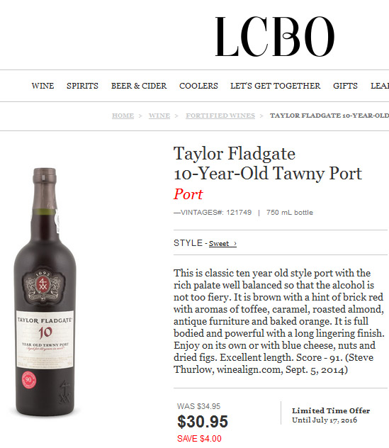 小编最新爆料:好多网友和小编说,马上要到加拿大国庆日了,再给大家推荐一款好喝的葡萄酒。有网友问,有没有一款好喝的甜的葡萄酒?确实,小编以前给网友们推荐的法国红葡萄酒都是酸或偏酸的口味居多,而具有300多年历史的葡萄牙Taylor Fladgate酿制的10 Year Old Tawny Port 十年酿桶装茶色波特酒却是一款甜的葡萄酒,相当好喝。还有一个好消息是,LCBO目前正在对这款酒进行促销,一般LCBO能优惠个$1-2就不错了,这次竟然优惠了$4,机会难得哟。