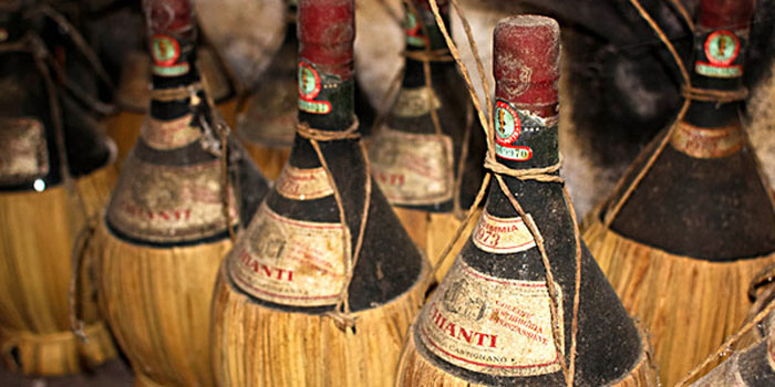这种近似球形的葡萄酒瓶,加上外面包裹的草编篮子,很难让人把视线从它身上移开——这是康帝产区(Chianti)一种传统的葡萄酒瓶,但在今天已经不多见了。