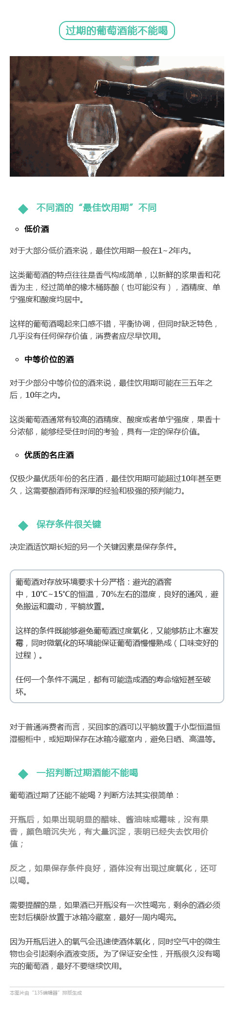 中国有一句古话,“姜是老的辣,酒是陈的香”。有人认为这句话同样适用于葡萄酒,甚至有人把过了保质期的葡萄酒当做“上等陈酿”。是不是存放时间越久,葡萄酒越好喝?过期了还能不能喝?赶紧收藏这一份“葡萄酒饮用指南”,下次聚会用得上。