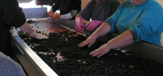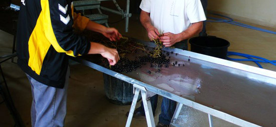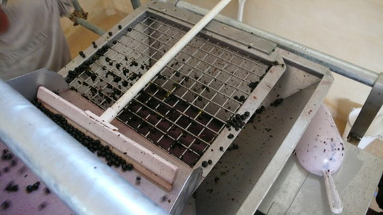 葡萄打成粒儿以后,会有一些不是很好的葡萄粒,没有熟透的葡萄粒或是小块儿的葡萄梗,所以要通过挑拣,把这些东西头挑出来扔掉,以免影响葡萄酒质量