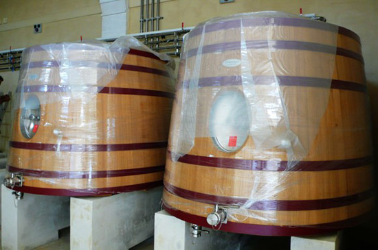 上面是7个大木桶~~~每年Chateau Ausone加上Chapelle d'Ausone就这7个桶里的酒,当然现在还不知道谁是Chateau Ausone谁是Chapelle d'Ausone,因为这要等发酵完以后,把他们装在小木桶里,进行第二次发酵(果酸转化乳酸),一年多以后才能得出结果。所以谁能成为更贵的酒,主要看它们在小木桶里的造化了~~