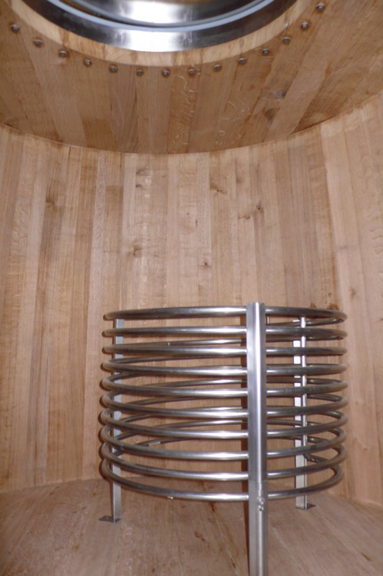 也许你们会问,上面的那张图片是什么东东,其实那是木桶的里面,那个三条腿儿的东西是一个冷热交换器,就像暖气一样的东东,功能和上文提到那个为酒降温的桶是一样的,也是有电脑控制水流控制温度。酒在发酵的时候,会放出热量,所以温度可以升到很高,当温度过于高的时候,会是发酵速度过快或是延缓。所以靠他来调节温度,不至于使温度过高或过低(我们也可以通热水)发酵的温度控制,取决于酒庄,不同的酒庄有着自己的方法,在这里我就不过多的去说了。不过书上会告诉你们控制在28摄氏度左右~~~其实这都不是固定的。(在发酵的期间,还会有些技术,这里我就不一一解释,感兴趣的朋友可以到网上查一查,毕竟每个酒庄的技术可能都不一样。)