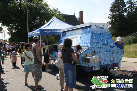 这里有让人们免费喝水的地方。看大篷里的介绍说,多伦多的公共场的饮用水的质量特别高,可以放心地直接饮用。