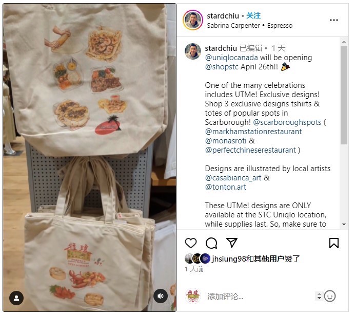 UNIQLO联合雅琼海鲜酒家等士嘉堡三大餐饮名店 推出联名T恤与手提袋 据《多伦多星报》报道,这次合作不仅提升了UNIQLO在士嘉堡的知名度,也让这些本地餐厅在全球范围内受到关注。其中,雅瓊海鲜酒家以其实惠的价格、24小时营业和社区精神而倍受好评。恒泰集团的发言人表示:“我们很荣幸能够成为优衣库合作的中式餐厅,这充分体现了我们在士嘉堡美食界的重要地位。非常感谢社会各界多年来对我们的支持。”