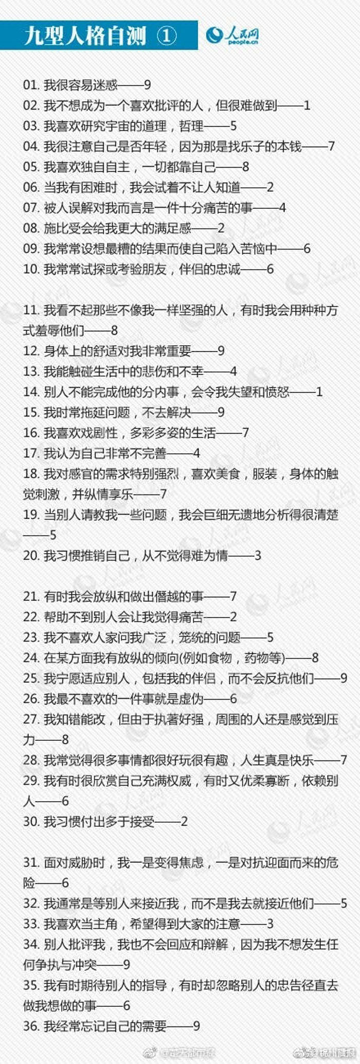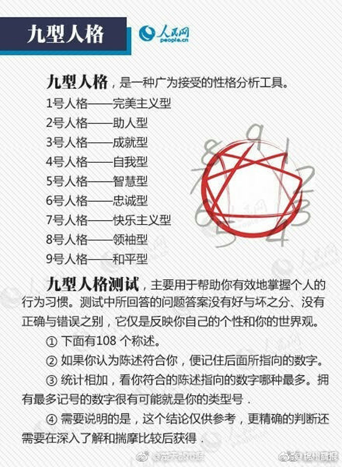 听说过“九型人格”吗?这是一种古老的心理分型理论,它将人的性格分为九种:①完美主义型;②助人型;③成就型;④自我型;⑤智慧型;⑥忠诚型;⑦快乐主义型;⑧领袖型;⑨和平型。你是哪一型?更好了解自己、规划前程!