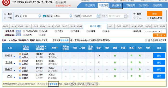 据中国铁路总公司有关部门负责人介绍,10月12日起,旅客通过12306网站或手机客户端购票,当遇到出发地和目的地之间的列车无票或没有直接到达的列车时,旅客可选择“接续换乘”功能,售票系统将向旅客展示途中换乘一次的部分列车余票情况,如果旅客选择购买,可以一次完成两段行程车票的支付。
