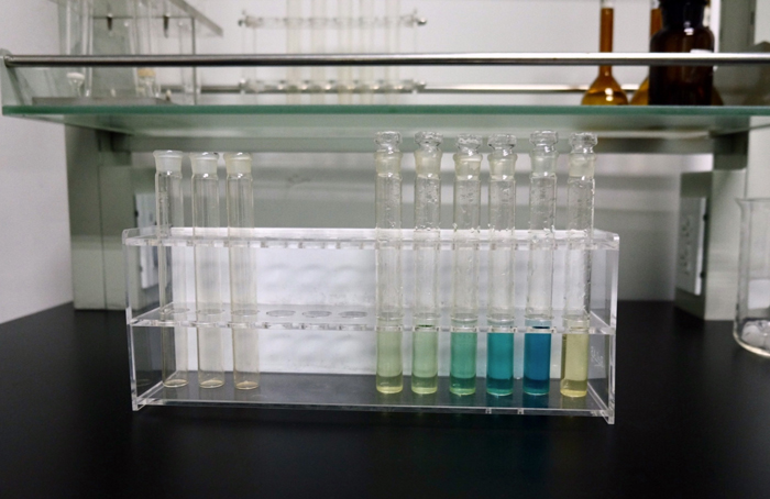 随后,实验人员将器皿中的液体和一定浓度的试剂(甲醛吸收液)混合,肉眼可见液体变为深浅不同的蓝色,蓝色越浅,说明甲醛含量越少。