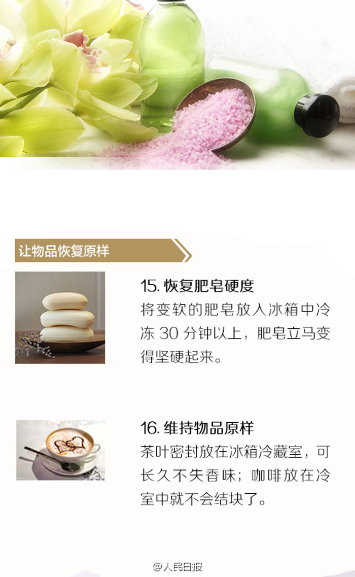 超实用!冰箱的16大神奇功能:1、让豆类快速煮烂:豆类煮开后冷冻2小时,20分钟就能煮烂;2、炒米饭更美味:米饭出锅后冻一两个小时,炒出来就会一粒一粒的;3、恢复肥皂硬度:变软的肥皂冷冻30分钟以上;4、延长丝袜寿命:新丝袜冷冻一至两天,会不易破损…冰箱鲜为人知的16个妙用,转给身边人!