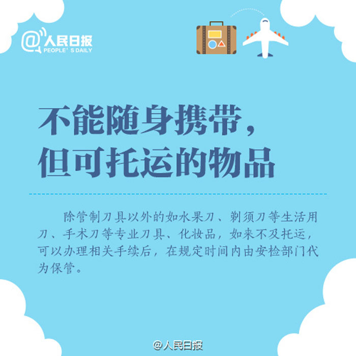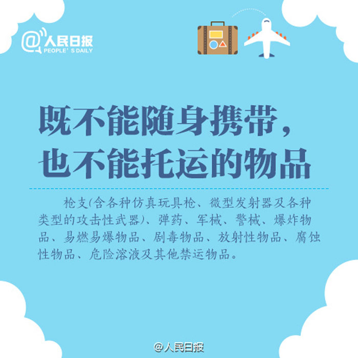 ①经济舱随行行李限1件,限重5公斤;②免费行李托运限重20公斤;③备用锂电池、充电宝只能随身携带,不能托运;④打火机、火柴既不能随身带也不能托运;⑤化妆品每种限带一件,容积不超过100毫升……国内航班行李规定,留存备用!