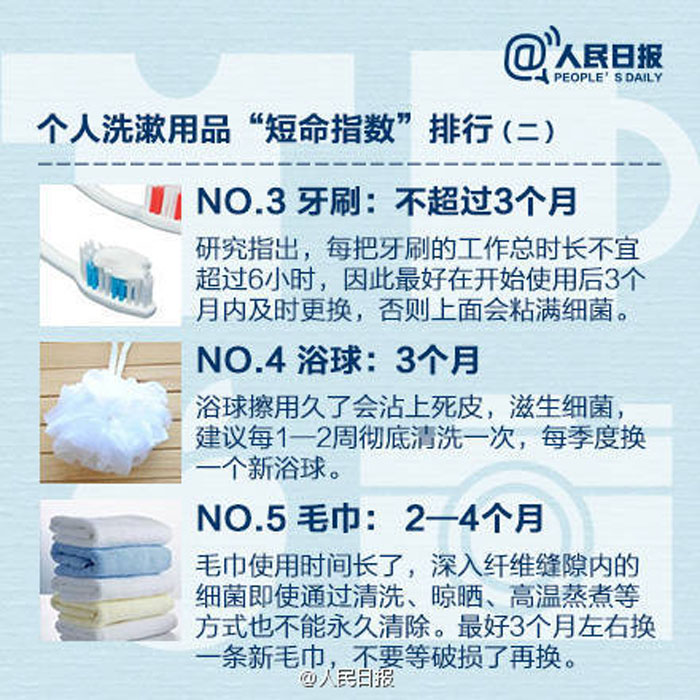 牙刷使用不能超过3个月,毛巾使用2—4个月就要换,竹木餐具使用寿命不超过1年,眼药水开封后最多用30天……这些日常物品,如果寿命到了还继续使用,就可能损害健康。